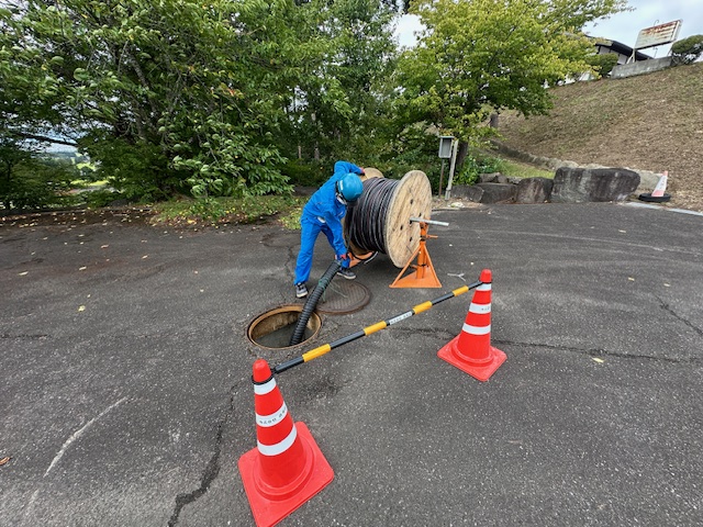 原因究明後は、その区間ケーブルの引き直しとなります。長さが400mを越えますが、今回は途中に接続点を設けず、一気通貫の敷設としました。